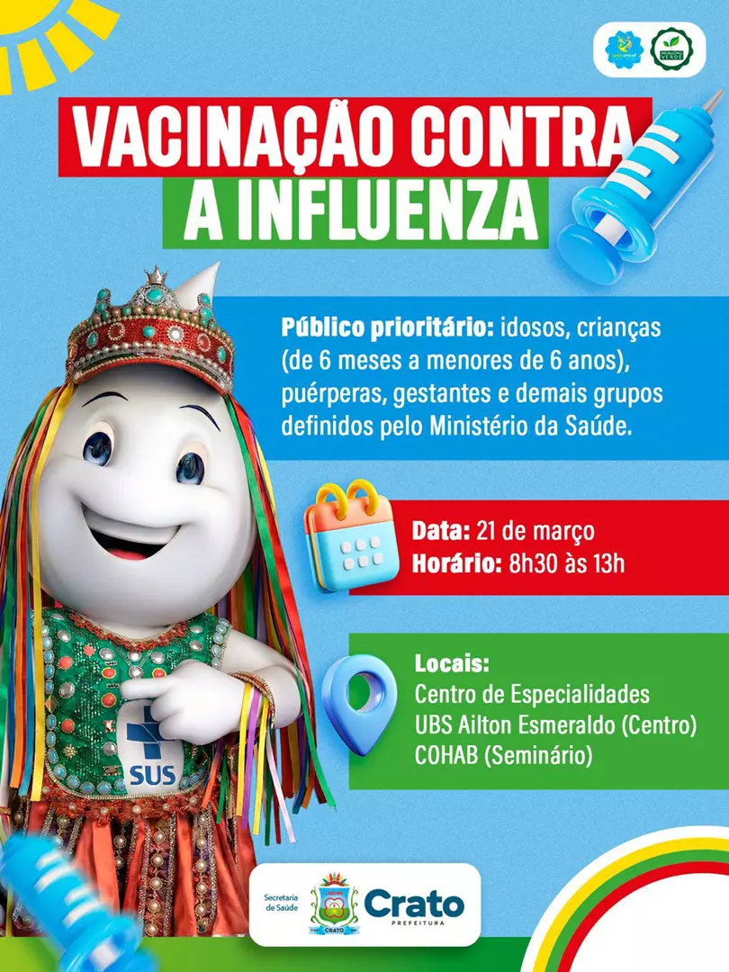 A Prefeitura do Crato, por meio da Secretaria Municipal de Saúde, inicia neste sábado, dia 21 de março, a campanha de imunização contra a influenza, reforçando a importância da prevenção e do cuidado com a população.
